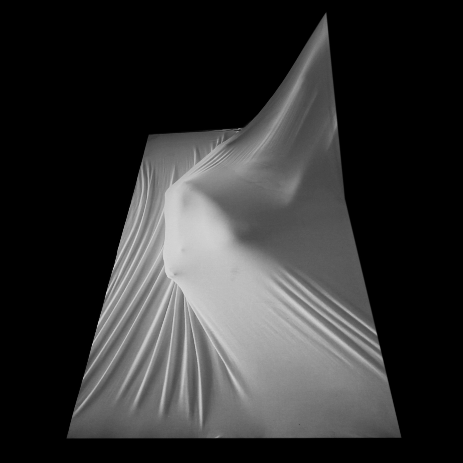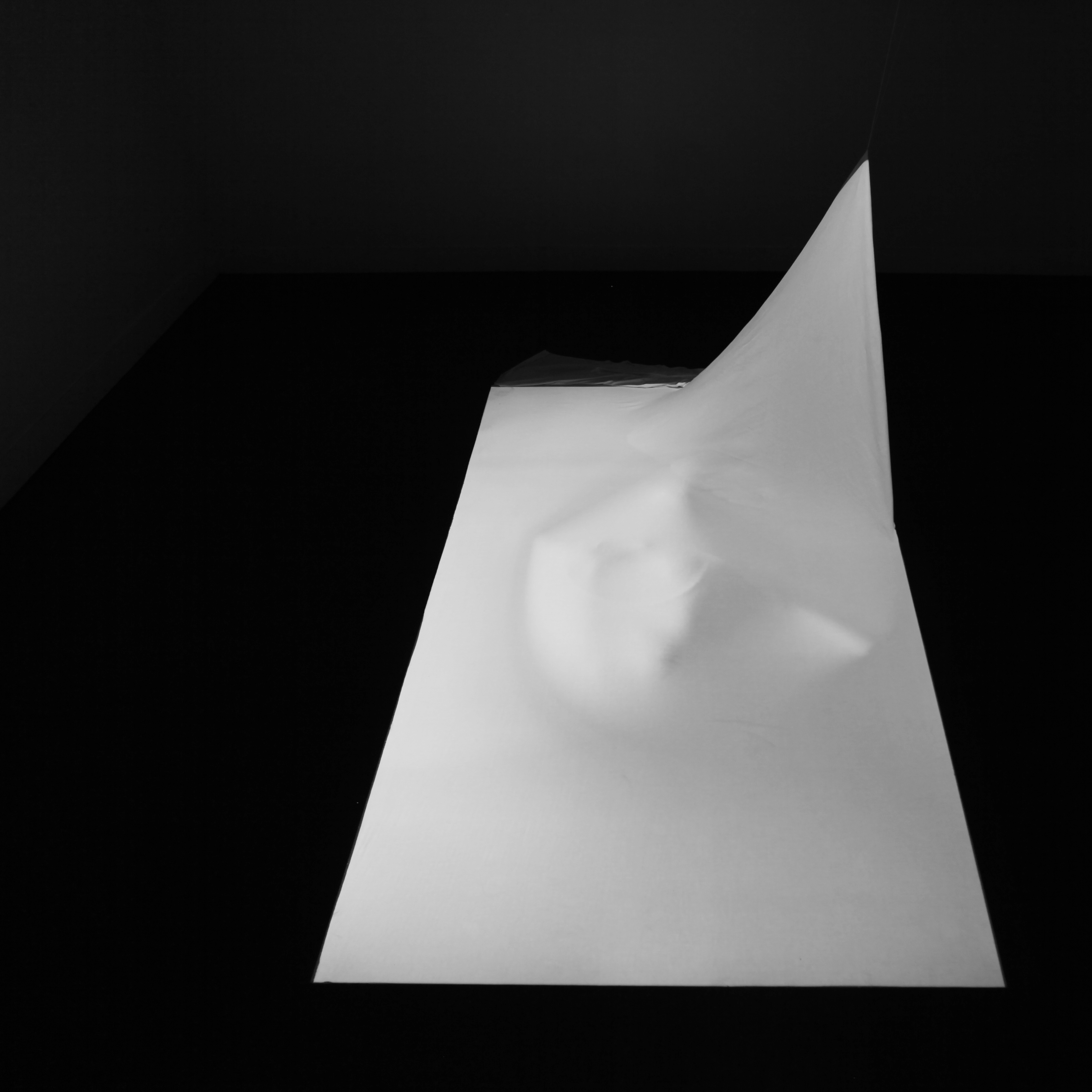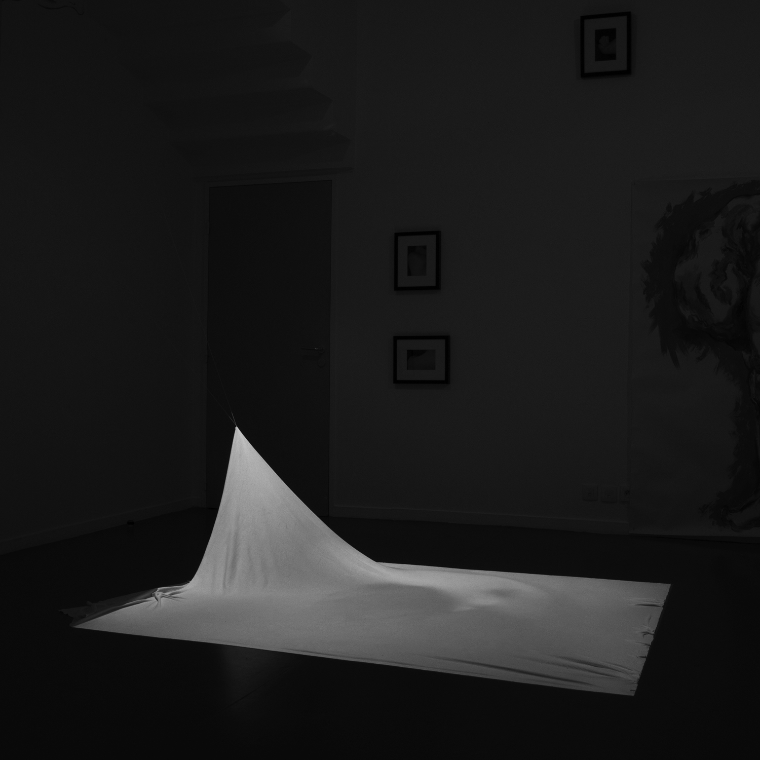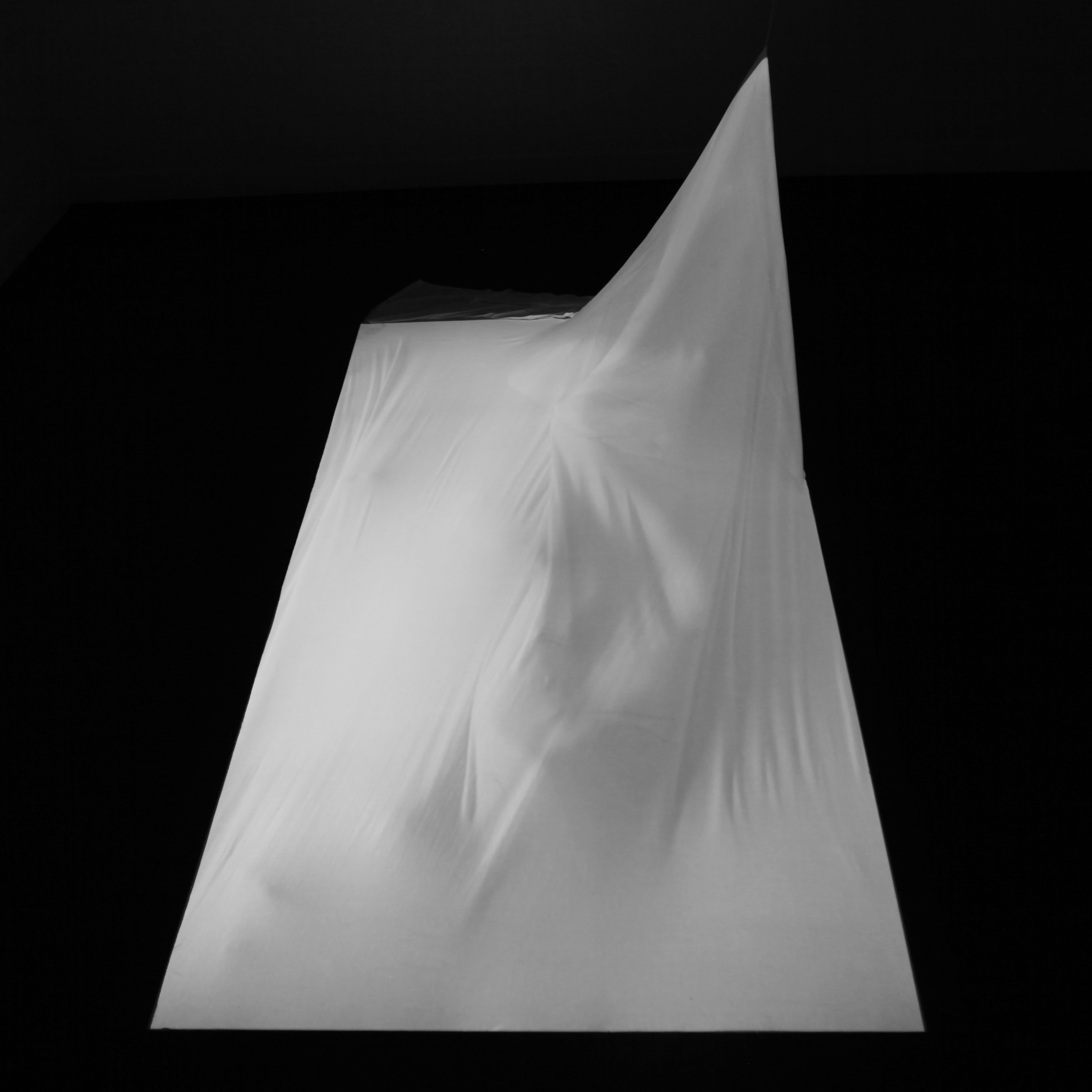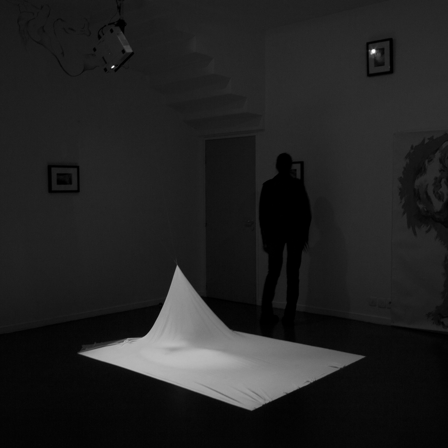 Laken 11215-1 est un dispositif plastique issu d’une recherche collaborative entre Aurélie Fatin et Sophie Deschamp qui mêle à la fois installation textile, vidéo et son. Toutes deux plasticiennes, elles ont décidé d’explorer ensemble la frontière entre réel et virtuel, en mêlant leur pratiques d’installation textile pour l’une et de dispositif avec vidéoprojection pour l’autre. Jouant du trouble qu’ entraîne la projection vidéo sur le textile mis en place, le dispositif nous fait douter : Y a t’il une présence sous ce drap? Et quelle présence? Humaine, animale, hybride? Réelle , virtuelle imaginaire? Déambulant dans l’espace, le visiteur s’aperçoit que cette membrane est un support à la projection vidéo, mais l’installation vient aussi suggérer qu’il existe un « espèce d’espace » où a pu se loger un corps.